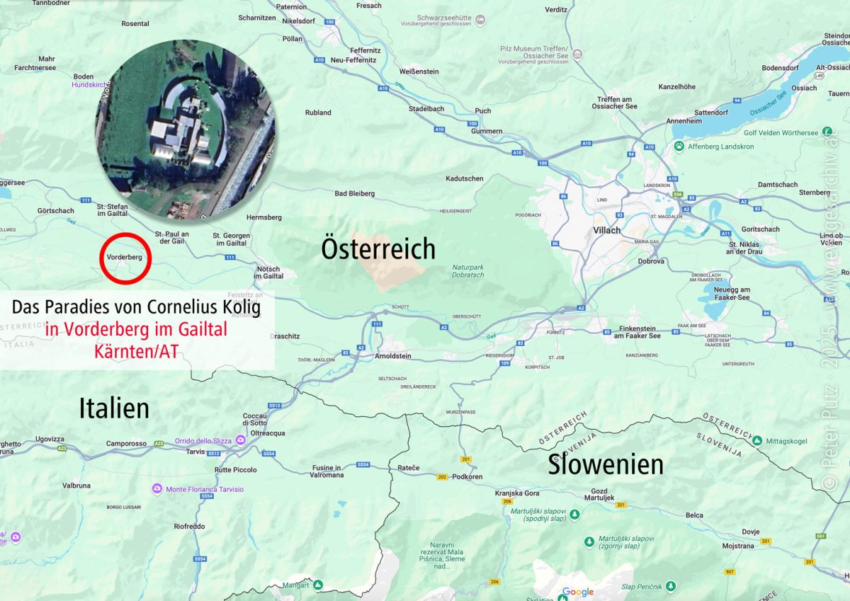 The extensive grounds of Cornelius Kolig’s paradise in Vorderberg in the Gailtal valley in Carinthia/AT are looked after and maintained by the Kolig family. The grounds are not open to the public. Guided tours are possible by prior arrangement.